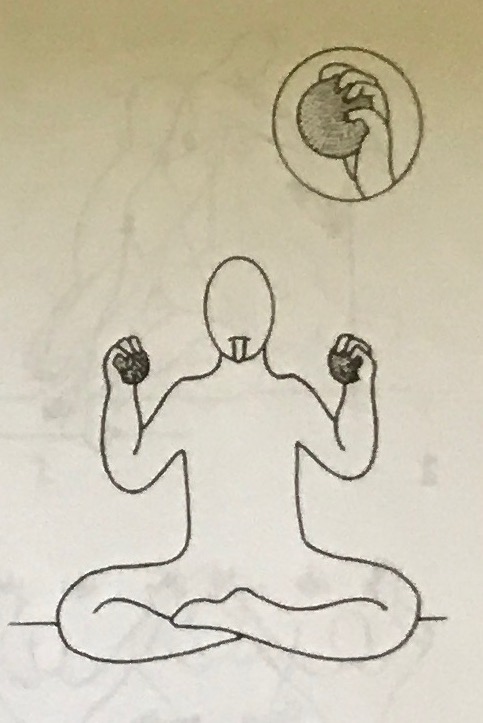 1. Сядьте в Простую Позу, в каждой руке держите по апельсину. Вдавите пальцы в апельсин, как будто держите его в когтях льва. Руки согнуты в локтях, кисти с зажатыми апельсинами находятся над уровнем плеч и направлены друг на друга. Глаза смотрят на кончик носа, язык высунут. С силой впейтесь в апельсины ногтями, пусть они по-настоящему погрузятся внутрь. Пальцы являются контактами пяти отделов мозга и представляют правое и левое полушария. Слушайте запись мантры "Ракхэ Ракханхар" в исполнении Ниринджан Каур. Запись должна звучат очень тихо. Сохраняйте позу 17 минут.