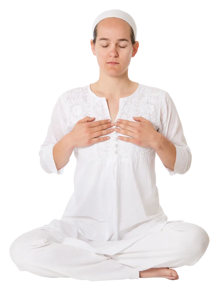 ДЫХАНИЕ: ключом к этой медитации является внимание к дыханию. Вдохните глубоко и полностью в течение 5 секунд. Выдохните полностью в течение 5 секунд. Задержите дыхание на 15 секунд, приостановив движение груди, втягивая Пупочный центр и живот.
