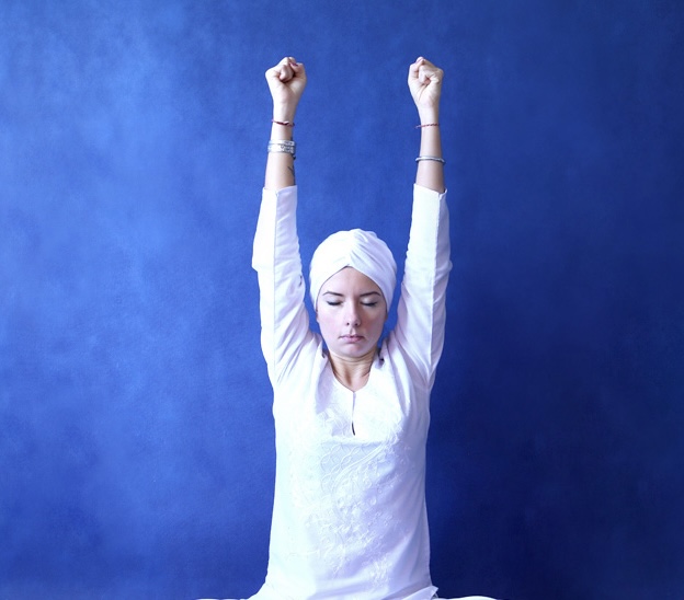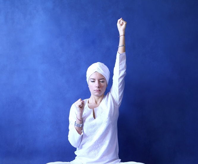 ПОЗА: продолжая сидеть в Простой позе, вытяните обе руки вверх. Сильно сжимайте кулаки. Руки должны быть идеально прямыми. Всё внимание поместите в позвоночник. Удерживайте Горловой замок, чтобы энергия свободно протекала по позвоночнику до макушки головы.