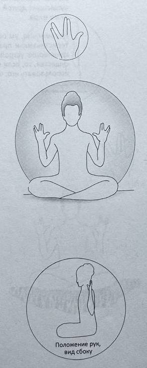 ПОЗА и МУДРА: Сядьте в Простую Позу, выпрямите позвоночник. Разведите пальцы так, чтобы они образовали букву «V», при этом пальцы Меркурия (мизинцы) и Солнца (безымянные) соединены вместе, и пальцы Юпитера (указательные) и Сатурна (средние) соединены вместе. Большие пальцы отведены от кисти. Основания ладоней находятся приблизительно на уровне плеч, ладони обращены вперёд. Кисти рук и локти - на одной вертикальной линии. Сведите лопатки, равномерно их напрягая, так чтобы внутренние края лопаток были параллельны друг другу.