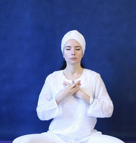 На 1, 3, 5, 7 и 8 строчки мантры перекрещивайте руки на Сердечном центре, одна поверх другой, ладонями к телу. В конце 8-ой строчки быстро опускайте руки на колени и поднимайте их снова, когда зазвучит 1-ая строка. На 2, 4 и 6 строки кладите руки на колени, ладонями вверх.