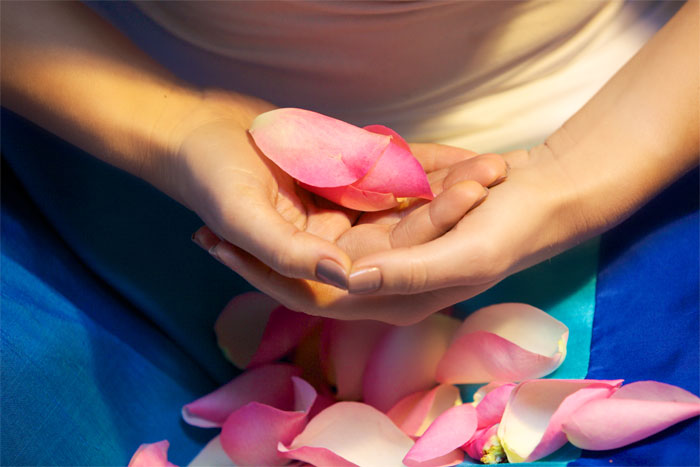Мудра Лотоса - сложите руки так, чтобы друг друга касались кончики мизинцев, основания ладоней и боковины больших пальцев. Другие пальцы напрягите и растопырьте как можно сильнее, чтобы они образовали подобие чаши или раскрытого цветка.
